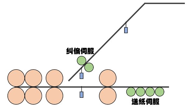 高速裱紙機(jī)運(yùn)動(dòng)控制器部分方案,主要控制面紙糾偏和送底紙功能,根據(jù)5個(gè)高響應(yīng)光電進(jìn)行位置信號(hào)采集,通過(guò)位置疊加和凸輪功能執(zhí)行需求動(dòng)作。