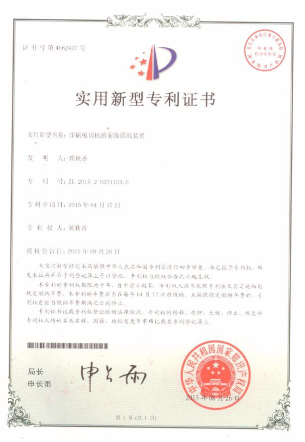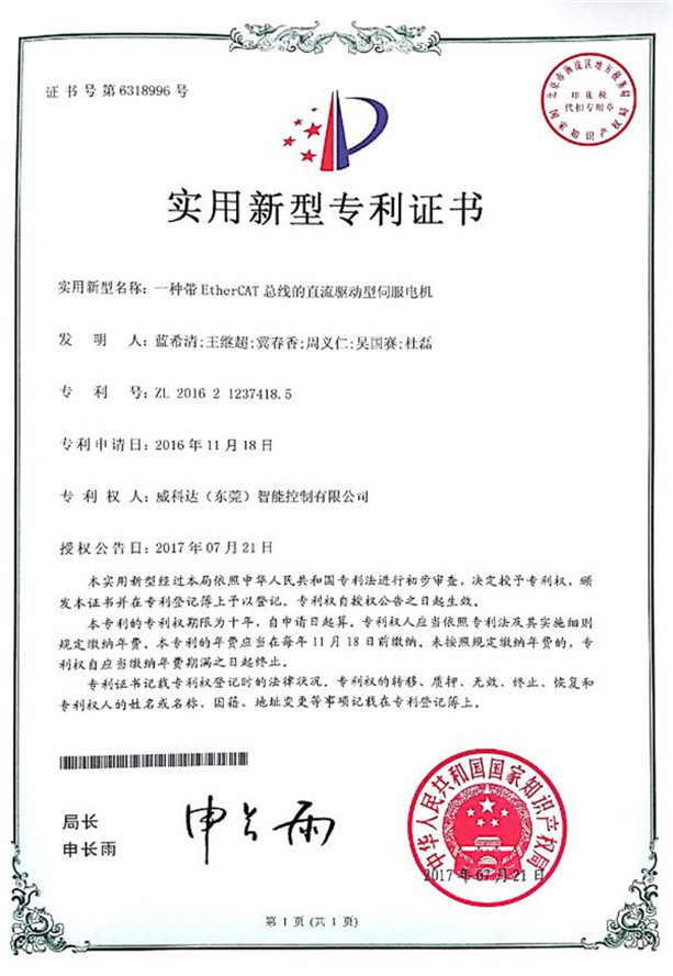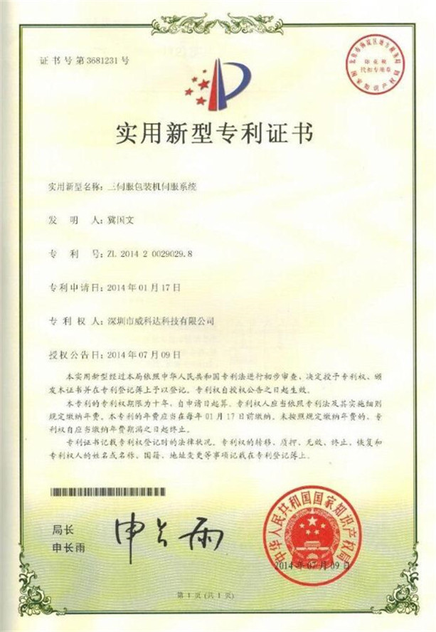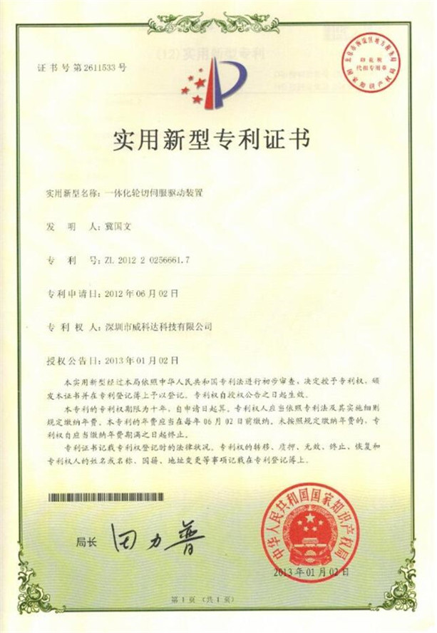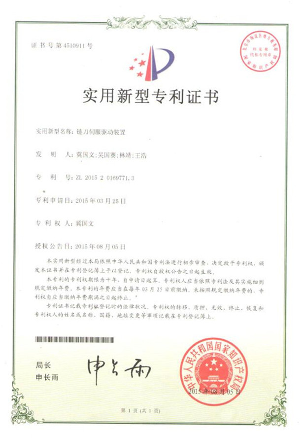 鏈刀伺服驅(qū)動裝置專利證書